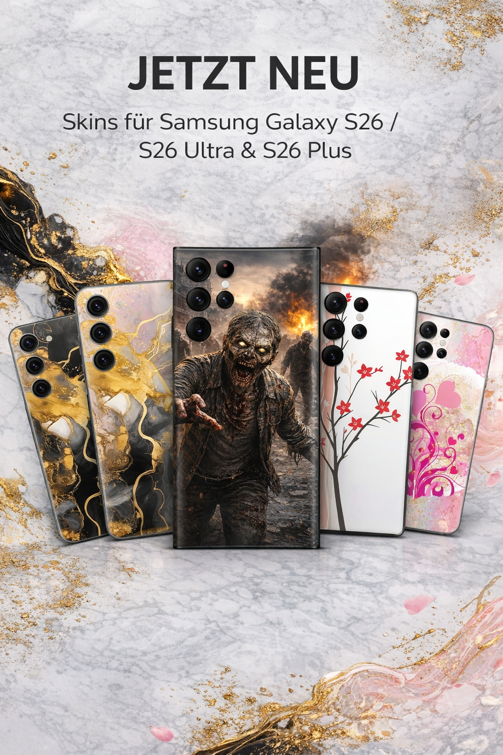 Entdecke unsere brandneuen Designs für das Samsung Galaxy S26, S26 Plus & S26 Ultra – von edlem Marmor-Look über verspielte Motive bis hin zu auffälligen Premium-Designs.